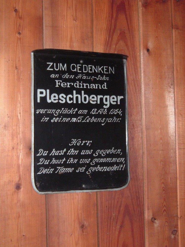 Auf Grund von Verwitterungen musste die Gedenkkapelle 2004 außen renoviert werden. Nach der Feldersegnung, die dort alle fünf Jahre abgehalten wird, wurde die Kapelle am 1. Mai 2004 von P. Simon Orec mit einer heiligen Messe eingeweiht. Das derzeit vorhandene Altartuch mit wundervoller Kreuzstickerei wurde anlässlich dieser Renovierung von Maria Stocker aus Peggau gespendet. Die rüstige, im 85. Lebensjahr stehende Altbäuerin Maria Pleschberger kümmert sich heute noch sehr liebevoll um Pflege und Schmuck dieses Juwels. Trotz der vielen Unglücksfälle, die die Familie Zink-Pleschberger im Laufe der Zeit erlitten hatte, hat sie den Glauben nicht verloren und mit der Kapelle ein sichtbares Zeichen hiefür gesetzt. Auf der schwarzen Gedenktafel des 1954 verunglückten Haus-Sohnes Ferdinand steht: Herr, |