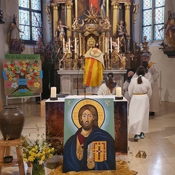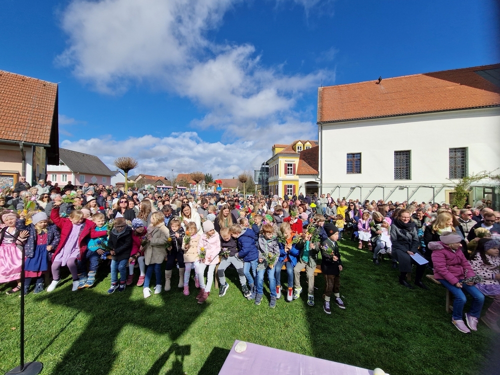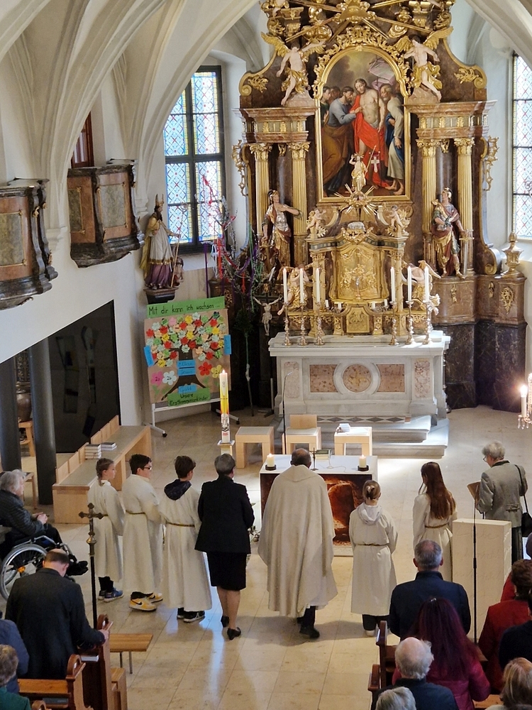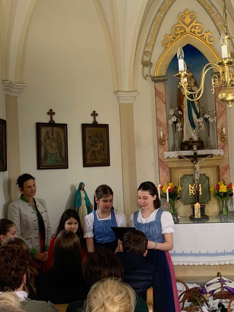 So feierten Groß und Klein mit Vikar Gerhard Hatzmann und Diakon Michi Zepf die heilige Messe zum Palmsonntag in einem schönen Miteinander. Die Kindergartenkinder sowie einige MS-Schülerinnen gestalteten die Feier mit und die MINIS versahen nicht nur ihren Dienst am Altar, sondern trugen auch die „Passion“ vor - in einer einfacheren Fassung, mit passenden Liedstrophen und Symbolen. Auch die Landjugend nahm teil und kam nach guter Tradition mit ihrem großen Palmbuschen.
