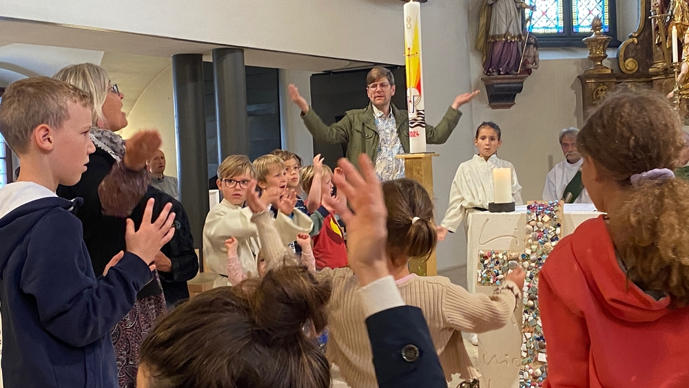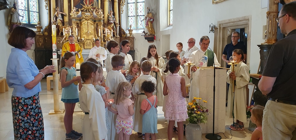 Einen bunten Familiengottesdienst, zu dem speziell die Taufkinder des letzten Jahres eingeladen waren, feierten Vikar Norbert Glaser und Diakon Michi Zepf mit Klein und Groß am 16. Juni in unserer Kirche.