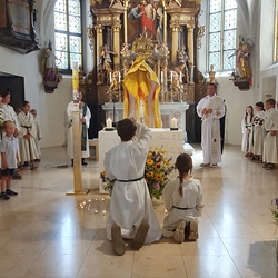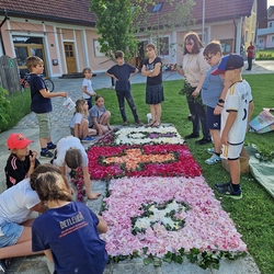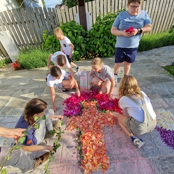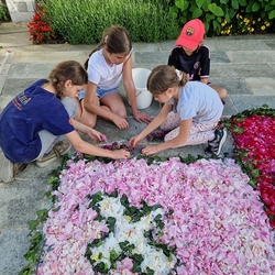 Mit großer Freude und Kreativität legten auch heuer die Minis am Vorabend zu Fronleichnam ein Blumenbild, diesmal sogar ein Tryptichon: Kelch und Brot, ein Kreuz und eine Taube wurden mit viel Eifer zuerst aufgemalt und dann mit den Blüten gestaltet.