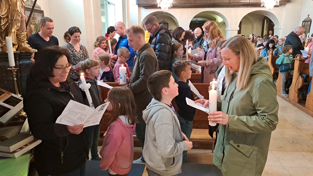 Im Anschluss des letzten Vorbereitungsworkshops in der Pfarre feierten die diesjährigen Erstkommunionkinder gemeinsam mit ihren Familien sowie Taufpatinnen und Taufpaten das Tauferneuerungsfest.