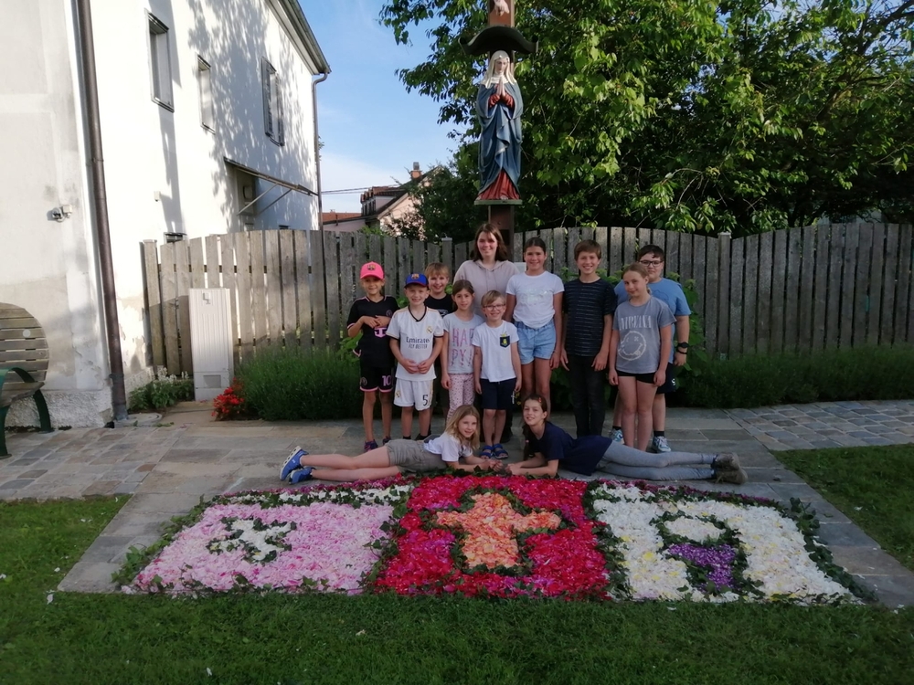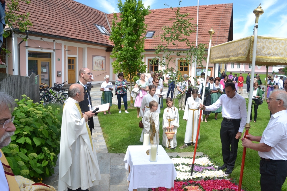 Mit Rosenkranzgebet und den Klängen der MUZ erreichte die Prozession schließlich den Kirchplatz, wo sich beim Altar vor dem Kreuz ein wunderschöner Blumenteppich befand, den die Minis am Vorabend mit großem Eifer gestaltet hatten. Diese „Augenweide“ wurde von vielen bewundert, auch von den mitfeiernden Gästen aus Wundschuh.