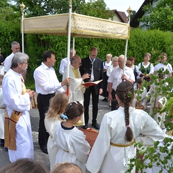 So konnte nach der heiligen Messe mit Vikar Norbert Glaser und Diakon Michi Zepf die Prozession wie geplant ihren Weg nehmen. An den vier Altären, die liebevoll geschmückt waren, wurde das Wort Gottes verkündet und Lobpreis, Dank und Bitte in Gebeten und Liedern ausgedrückt.